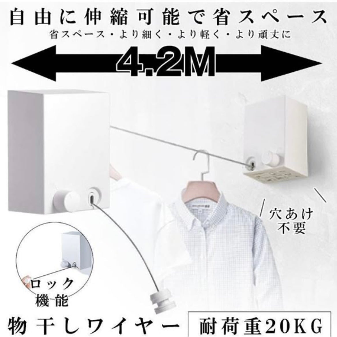心地よさと便利さを兼ね備えた、【伸縮物干しワイヤー|穴あけ不要タイプ】。お部屋やバルコニーでの洗濯物干しをスムーズにサポートし、生活空間を有効活用します!